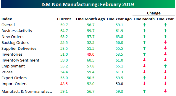 The U.S. services sector expanded at a faster pace in February as the non-manufacturing index climbed to 59.7 from 56.7 in January, on a seasonally adjusted basis, the Institute for Supply Management reported Tuesday. New Orders component of February’s ISM Services report hit its highest level since August 2005 and had its 3rd largest increase on record.