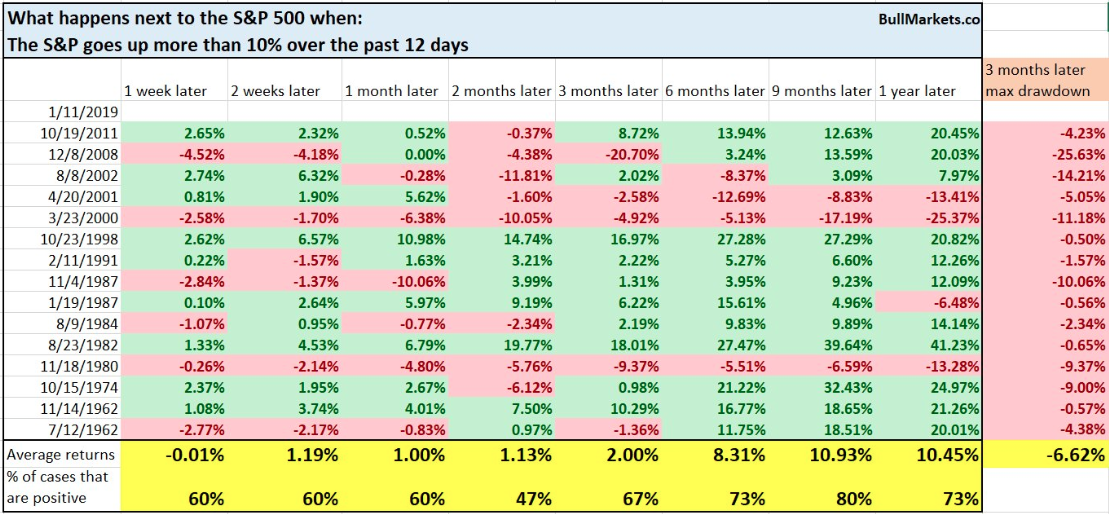 Many investors, analysts and market strategists believe that at some point in the not too distant future, a retest of the December lows (2,351) will occur. Finom Group discussed the reasons and rationale for this to probably occur in recent articles, but it’s not a guaranteed occurrence to be clear. Market Symmetry is a factor of human behavior and/or psychology. We are creatures of habit and the market tends to express human, habitual behaviors if not for confirmation bias alone. Even so, the S&P 500 is up more than 10% over the past 12 days. So let’s look at what the historic forward returns were under such conditions.