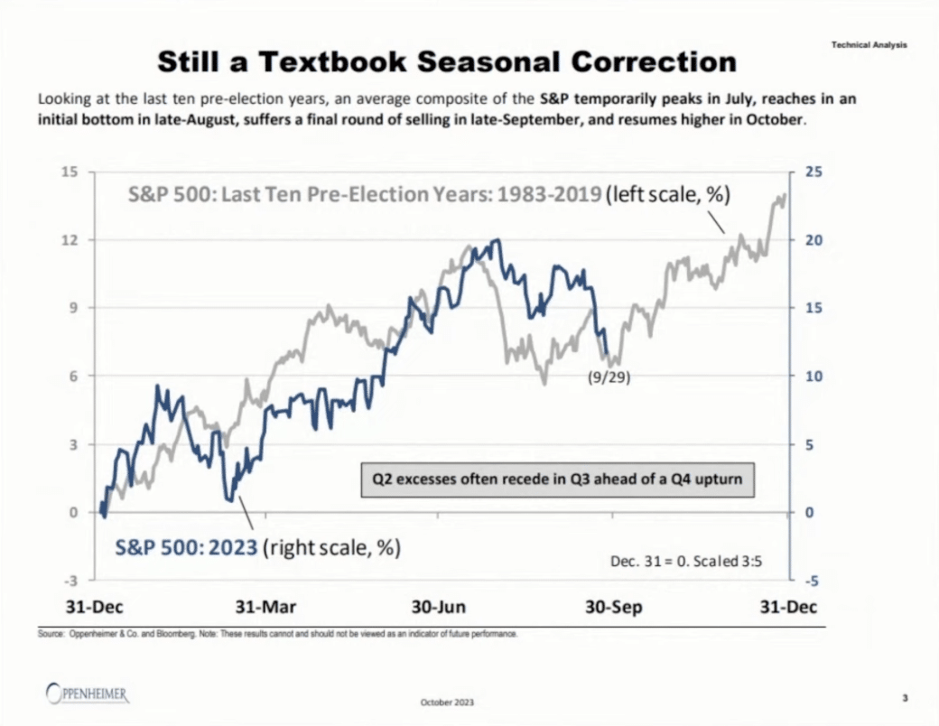 As such, I don’t view the trending and perceived headwinds (Govt. shutdown, China GDP, Excess Savings dwindling, Student loan repayments, rising yields/rates/dollar) as providing sustained headwinds for equities in the Q4 2023 period, as that may prove to be the sentimental price discounting that already took place. I don’t find valuations stretched on an individual or index level, currently 17.9X and below the 5-yr average. Most stocks and/or sectors are trading some 3X multiple points lower than the index’s forward P/E.