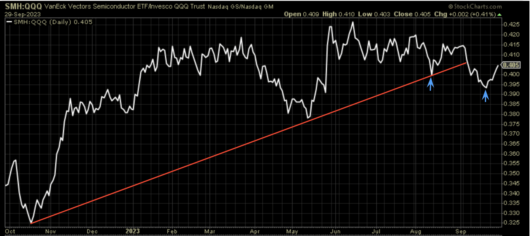 Our next chart analyzes the trend in possibly the most important performance ratio of 2023. Semiconductors have dominated the market’s performance in 2023, even if comparing its performance to the more Growth-oriented index, the Nasdaq 100 (QQQ).