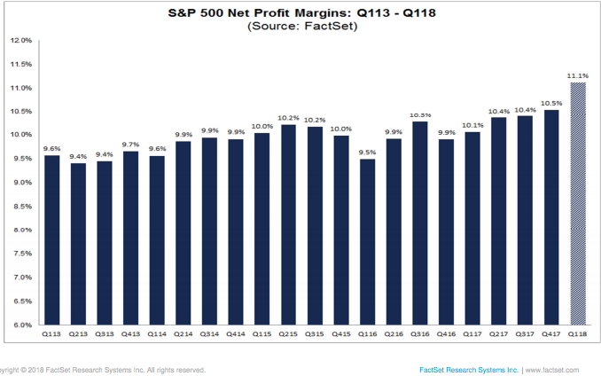 The blended net profit margin for the S&P 500 for Q1 2018 is 11.1 percent. If 11.1% is the actual net profit margin for the quarter, it will mark the highest net profit margin for the S&P 500 since Q3 2008, according to FactSet.