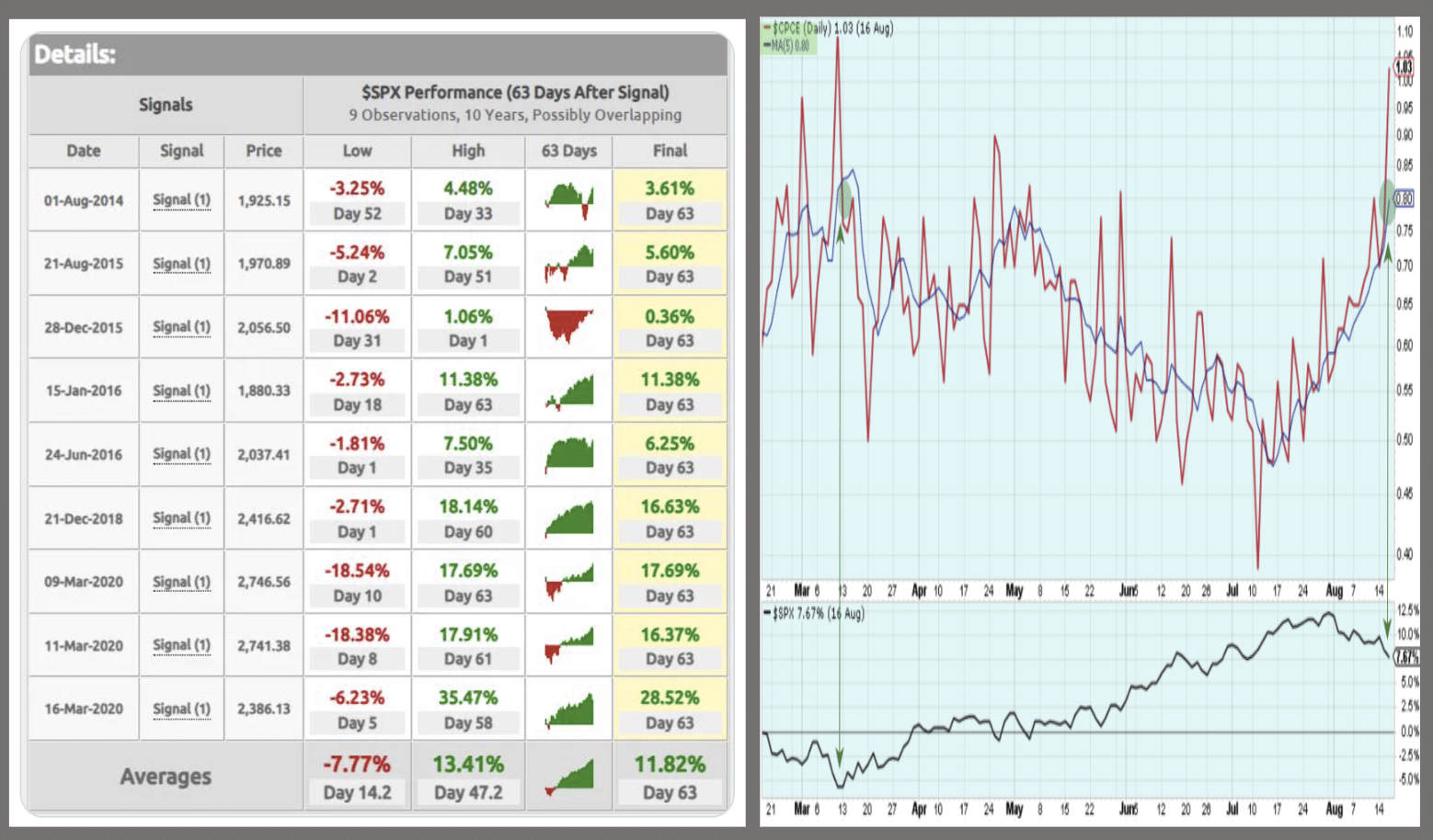 - The table above goes back to 2014, recognizing all P/C Ratio spikes above 1.0. As we can see, all 3-month forward returns from the signal date were positive for the S&P 500. The signals were not without their deeper drawdowns, also displayed in the table. Covid drawdowns were exceptional.