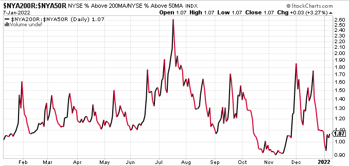 One of our more favored breadth measures is also in bullish territory, despite the poor price action this past week. The percentage of NYSE stocks trading above their 200-DMA RELATIVE to the percentage of NYSE stocks trading above their 50-DMA ended the week at 1.07.