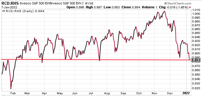 One signal that may also point to a near-term easing of selling pressure would likely come from the relative performance between the Consumer Discretionary ETF (XLY) and the Consumer Staples ETF (XLP). Recall from the YTD Sector performance chart above, investors have bid up Staples while selling Discretionary stocks. For this exercise we will use the Equal-weighted versions of both ETFs, given the top 3 stocks in the XLY make-up some 50% of the ETF. The Equal-weighted tickers are RCD and RHS, Consumer Discretionary vs. Consumer Staples.