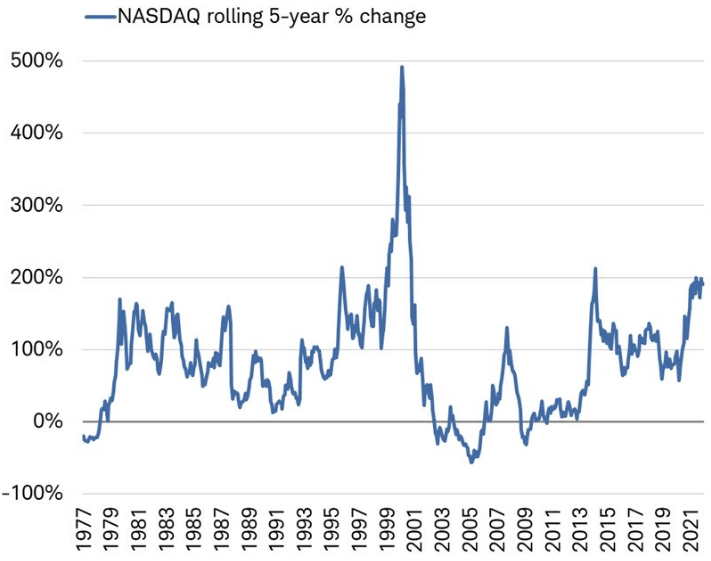 The textbook definition of a bubble is: Assets quadruple in value over a 3-year period. If this is a bubble, it’s the worst one ever. As of the end of 2021, NASDAQ’s rolling 5-year gain of 191% is impressive, but doesn’t come close to the 5-year gain of 492% as of February 2000 and during the Dotcom bubble!