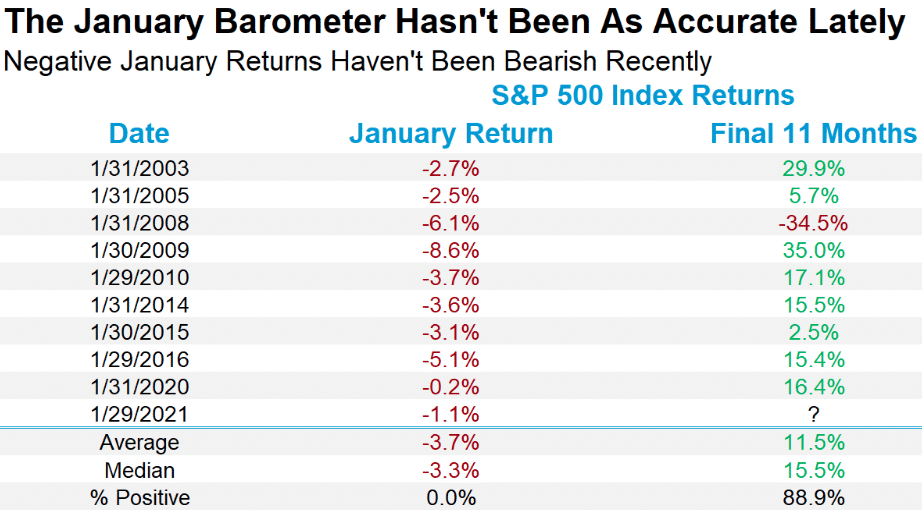 The catch is the January Barometer has been broken lately. In fact, a lower January for the S&P 500 has been bullish recently, with the final 11 months of a year higher 8 of the past 9 times after a negative January. Of course, the most recent 3 times (’15, ’16, and ’20) all had significant volatility. 2016 and 2020 were election years, go figure!