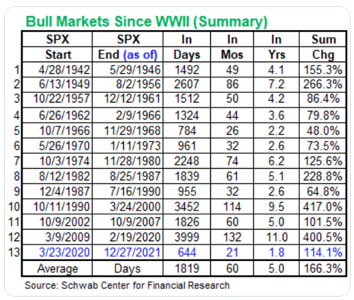 The table above identifies the cyclical bull markets since 1942. At just 21 months young, the table above suggests that the current cyclical bull market has many more months to run before finding another cyclical bear market. The only cyclical bull market that did not run at least 30+ months was back in 1966-1968.