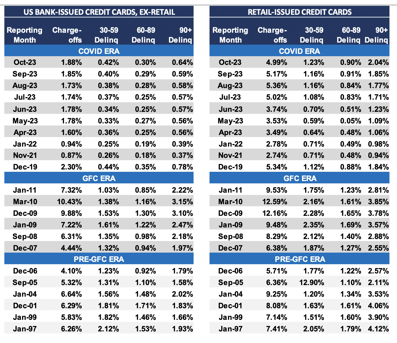 If we look at the Covid-Era left and right-side of the table for Bank-Issued and Retail-Issued credit card delinquency rates, we can recognize that delinquency rates are absolutely rising, and for both categories. Having said that, the absolute levels found leading up to or during previous recession were far higher than that of the present day. Do you like apples Mr. Punditry (Good Will Hunting)? Asking for a friend!