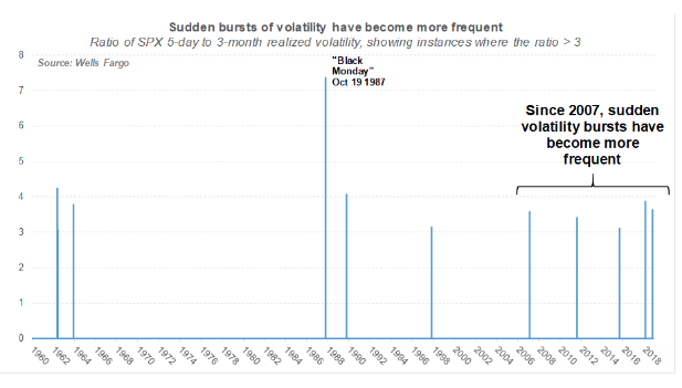The graphic looks at days when the ratio of 5-day to 3-month realized volatility exceeded 3. “In other words, days when there is a huge burst of volatility compared with what’s been the norm,” Chintawongvanich wrote. Since 2007, there have been six such events versus only five in the preceding 50 years. In fact, a 22-year stretch from 1964 to 1986 didn’t see a single one, he noted.