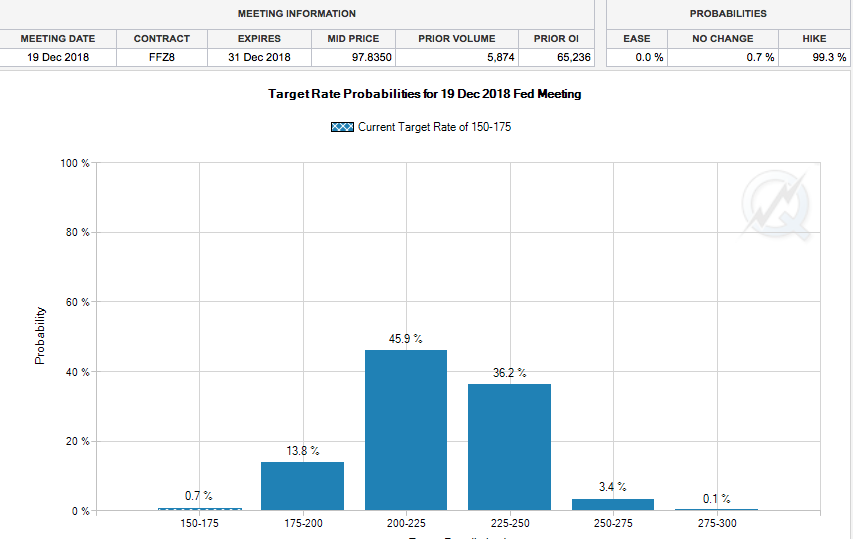 Equities rallied in the face of a sell-off in bonds and with the 10-yr Treasury yield creeping toward 2.95% once again. A recent speech by Fed Gov. Lael Brainard has helped dispel the belief that policymakers may hold off on a fourth rate hike this year. Brainard said she would not slow down the pace of rate hikes based on a flattening yield curve, which some have read as the bond market pricing in an economic slowdown. The CME’s FedWatch Tool has shown an increase in the probability of a 4th rate hike since bottoming last week below a 20% probability. Since then, the probability has increased to above 35% as shown below.