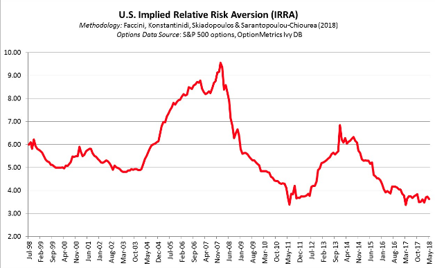 While individual stock performances will vary over time and sometimes find themselves impacted by headlines, the market is sending signals that the economy is expected to continue on its current path or growth trajectory. The options market, in particular, tells us the degree to which investors are averse to risk. The Implied Relative Risk Aversion data (IRRA) offers insights into how investors feel about the economy through their participation in the options market. A decrease in IRRA predicts an increase in economic growth because investors boost investments when they become less risk averse. Conversely, an increase in risk aversion points to a slowdown in growth because investors lower investments when they become more risk averse. Implied Relative Risk Aversion is currently very low, at 3.6 for May, implying that traders in the S&P 500 options market anticipate an increase in U.S. economic growth.