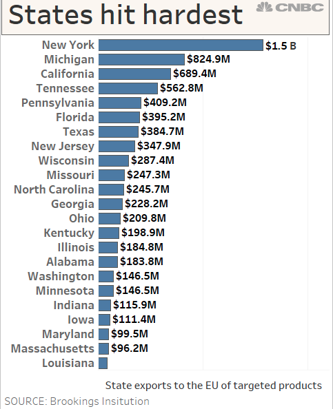 CNBC offered the following with efforts to demonstrate which states will be hit by the EU’s retaliatory targets.