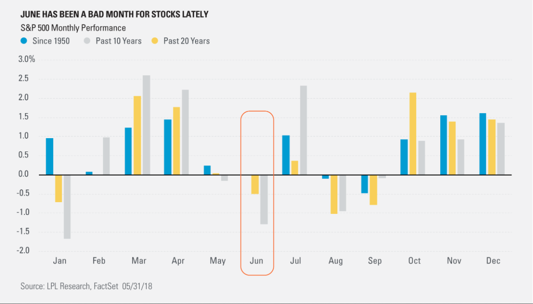 As shown in the chart above, over the last 10 years the month of June has produced a negative return of greater than 1 percent. Let’s see if June 2018 can buck this unfavorable trend. Any favorable news on global trade might go a long way to facilitating a positive performance for markets in June 2018.