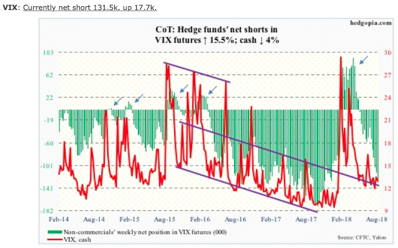 Flows were in full cooperation, as far as S&P 500-focused ETF’s were concerned. In the week to Wednesday, SPY (SPDR S&P 500 ETF), VOO (Vanguard S&P 500 ETF) and IVV (iShares core S&P 500 ETF) respectively took in $1.1 billion, $1.4 billion and $1.5 billion (courtesy of ETF.com). Defending S&P 500 2,800 was in full representation last week. On to our all-important representation of how hedge funds are positioned in VIX futures.