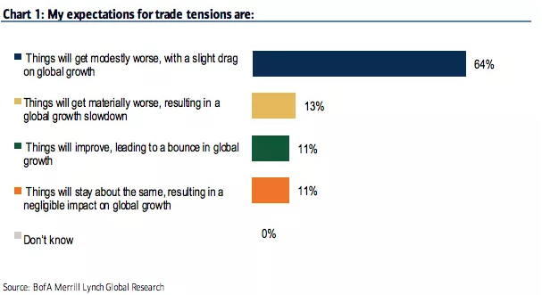 While the markets performed strongly since the U.S. administration outlined the next $200bn in tariffs to be levied against China by September, the fears surrounding a trade war have actually risen. In their latest rates and FX survey conducted on July 11 and representing the views of 58 fund managers responsible for $286 billion in AUM, BofAML found that 64% of respondents believe trade tensions are set to get “modestly worse” resulting in a drag on global growth.