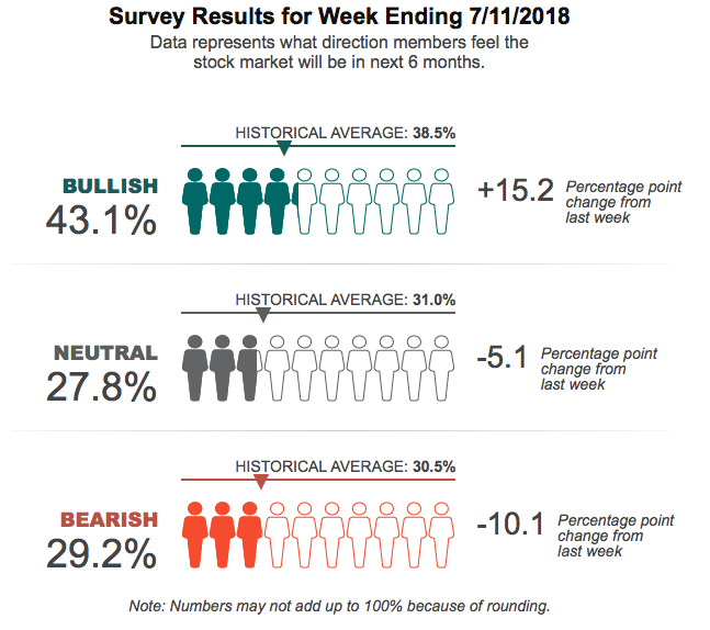 - Bullish sentiment, expectations that stock prices will rise over the next six months, rose 15.2 percentage points to 43.1%. Optimism was last higher on June 13, 2018 (44.8%). The historical average is 38.5%.