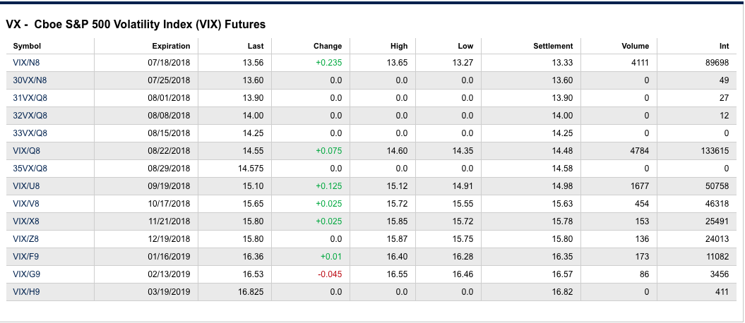 VIX/N8 is known as M1 or F1 (month 1 or futures 1) depending on whom you ask. The expiration of these futures contracts is 7/18 or next week Wednesday morning. Futures have a lifespan of roughly 1 month, expiring monthly. Going down the list of monthly VIX futures contracts we have the August VIX futures contracts identified by VIX/Q8, which will roll forward next Wednesday and expires on 8/22/18. Roll forward? As the VIX/N8 futures expire next Wednesday, the back month VIX futures contract roll forward to take its place. The former m2/f2 becomes the new m1/m2. And so on down the list of VIX monthly futures contracts.