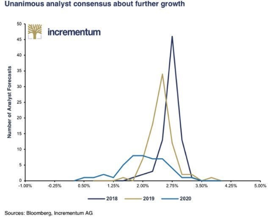 With regards to the strength of the U.S. economy, most economists forecast a continued era of economic expansion out to 2020. The Incrementum chart below shows a survey of 78 analysts’ forecasts on future GDP growth as performed by Bloomberg.