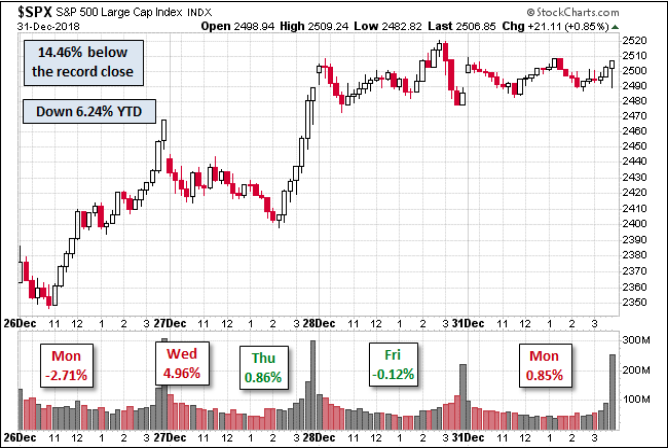 After the worst December since 1931 and the worst year since the financial crisis, stocks enter 2019 hobbled. The S&P 500 (SPX) will begin trading at 2,505 in 2019 after finishing down 6.2% in 2018, and down 9.6% in December alone.