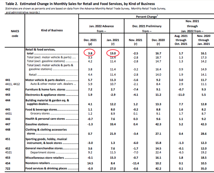 Retail sales jumped 3.8% in January and jumped 3.3% excluding autos, double the economists’ expectations. Those follow respective declines of -2.5% in December. Sales excluding autos, gas station sales and building materials also climbed 3.8% from -3.4%. The consumer is alive and doing quite well. The YoY January retail sales growth remained in double-digit territory, growing 13 percent. While this is slower than the average YoY mid-teens growth from 2021, it still very much supports above average 10-year GDP rates in 2022.