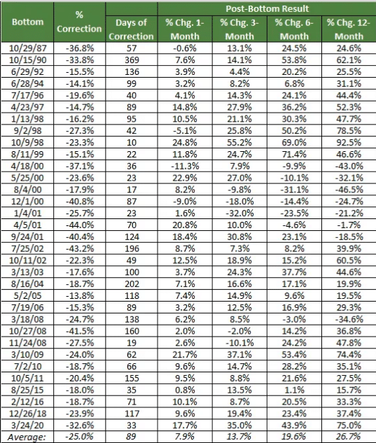 So what happens during and after the typical correction/bear market for the Nasdaq Composite. The results were not all that surprising. Perhaps most noteworthy is the fact that the market always bounces back, and usually sooner than you might expect.