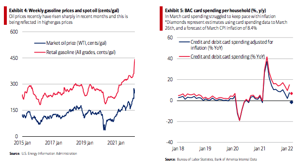 Time to tighten the belt? “Faced with higher prices for items consumers really need like gas and food, they could either allow their total spending to rise to keep overall spending plans on track, or spend less on lower-priority ‘nice to have’ items to keep a lid on total spending. There are some signs that spending growth among lower-income consumers is indeed slowing for some more discretionary items. In particular clothing and furniture spending growth has slowed sharply relative to a year earlier according to Bank of America data. For now the level of spending compared to pre-pandemic times is still relatively high – but this drop-off in spending on more discretionary items could be indicative of lower income groups feeling some pressure.”