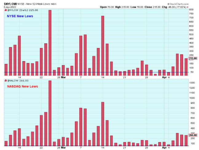 While New Lows for both indices are creeping higher once again and is not a positive sign for maintaining the 50-DMA level for the indices, one would think that the Nasdaq would have a much higher level of New Lows given the outsized decline this past week and a 2-week decline for the index. But that just isn’t the case. The NYSE with a lesser decline this past week has far more lows over the course of the past week. I’m still assessing this interesting dynamic, but it could further validate that the lows are already in for the Nasdaq, barring macro-fundamental deterioration.