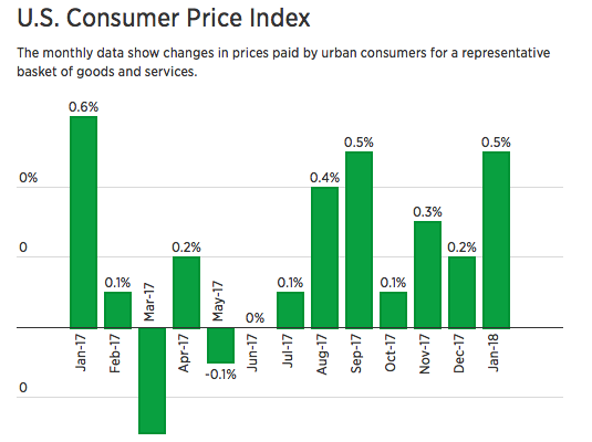 Well, the economic data released today was anything but favorable and yet the market, for now, is seemingly shrugging off the data. Everyone was waiting with bated breadth for the inflationary data coming into today’s market trade, hoping for a benign reading. But what they got was worse than expected in the way of CPI. The Consumer Price Index rose 0.5% last month against projections of a 0.3% increase, the Labor Department reported Wednesday. Excluding volatile food and energy prices, the index was up 0.3% against estimates of 0.2 percent. Headline CPI rose 2.1%on an annualized basis against expectations of 1.9 percent. Core CPI increased 1.8% vs. estimates of 1.7 percent.