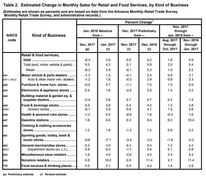 Equally abysmal with regards to the latest economic data released today were monthly retail sales. January retail sales fell unexpectedly in their biggest drop since last February, declining 0.3 percent. Combined with inflationary concerns, these data points may tamper expectations for Q1 2018 GDP. Stripping away volatile auto sales and retail sales ex-autos were unchanged, far below the 0.5% expectation.