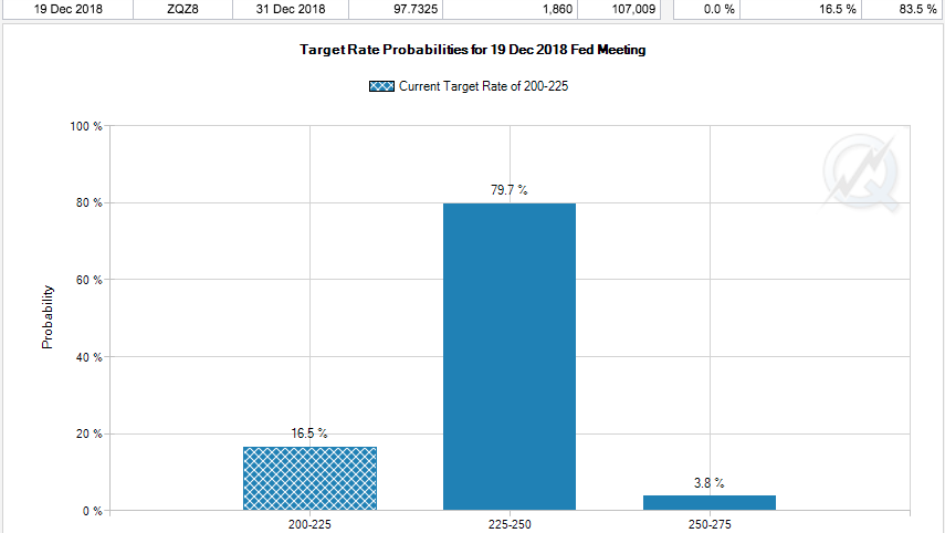 With regards to the Fed hiking rates, the economy can withstand rising rates, but slowing is slowing and that could affect equity valuations. For investors, that is all that really matters. That comment brings forward the question of whether or not the Fed should raise rates, as it already plans to do, come December. The market already largely expects the Fed to raise rates by another .25% bps in December as depicted by the CME’s FedWatch Tool.