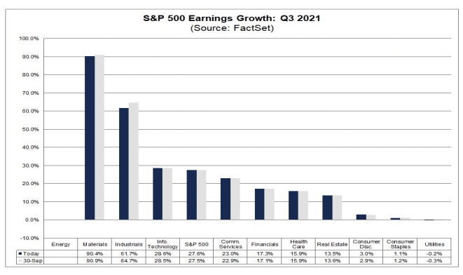 - For the third quarter, S&P 500 companies are projected to report earnings growth of 27.6% and revenue growth of 14.9%.