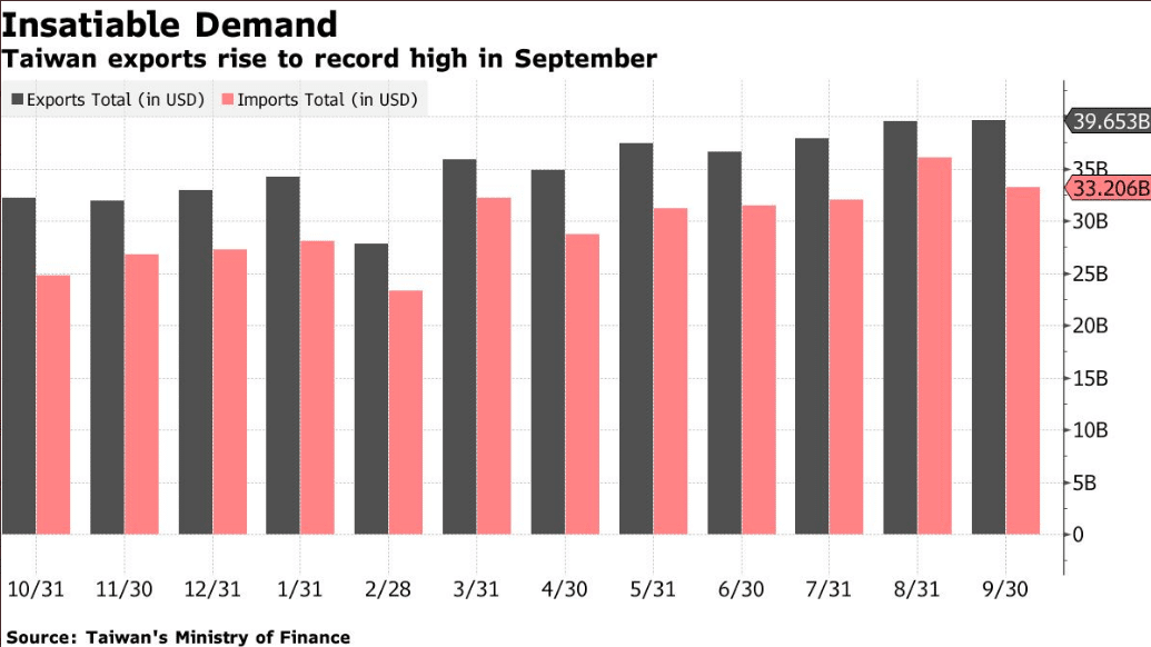 Taiwan’s exports grew faster than even the most bullish economist forecast last month, fueled by ongoing global demand for semiconductors. Exports rose 29.2% in September from a year earlier to a record $39.7 billion, according to a statement from Taiwan’s Ministry of Finance on Friday. That compares to a median estimate of 25% in a Bloomberg survey of economists. Imports surged 40.4% to $33.2. September’s figures benefited from resurgent worldwide demand, especially for electronic devices and new technologies such as 5G, according to the ministry’s statement. The decision by several major chipmakers to raise prices in recent months also bolstered figures. That’s a lot of crap going into and out of Taiwan is it not, crudely asked?