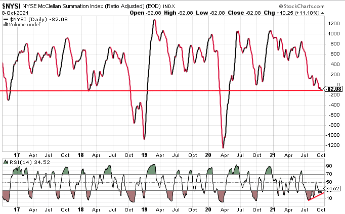The negative reading in the NYSI over the last 6 weeks, but recent 2-day advance might indicate that many stocks have bottomed and turned higher. The following chart of the NYSI offers one last perspective on broad market, long-term breadth (5-yr. chart)