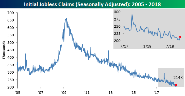 This week’s report on initial jobless claims was disappointing, depending on how one looks at it. While economists were expecting claims to ratchet up to 210K, the actual reading came in at 214K. This week’s increase represents the largest 1-week rise in claims since May and put the actual reading at the highest level in a month.