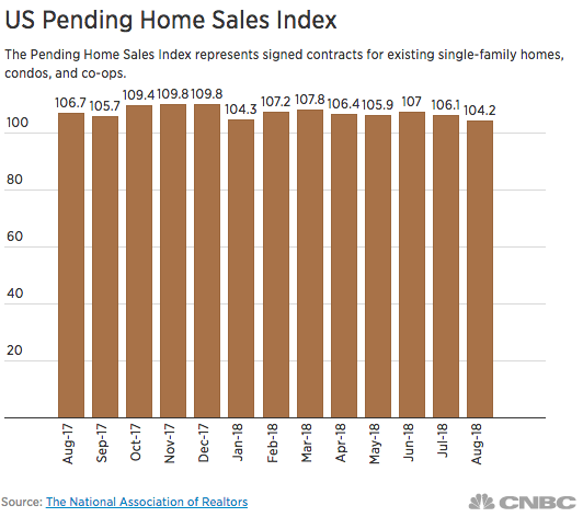 Pending home sales fell 1.8% for the month, according to the National Association of Realtors’ seasonally adjusted index. Sales were down 2.3% compared with August 2017. That was the 4th monthly decline in the past five months and the slowest sales pace since January.