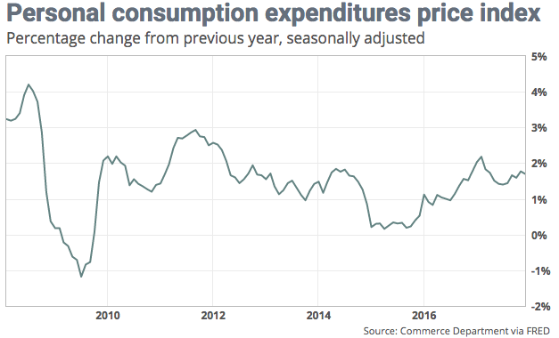 The rate of inflation, using the Fed’s preferred PCE index, rose to 1.7% last year from 1.2% in 2015 and just 0.3% in 2014. The U.S. economy is stronger, wages are rising, labor shortages are worsening and “now you have all the fiscal juice,” said senior economist Sal Guatieri of BMO Capital Markets, referring to recent tax cuts and increases in government spending. Putting it all together, inflation should increase in 2018.