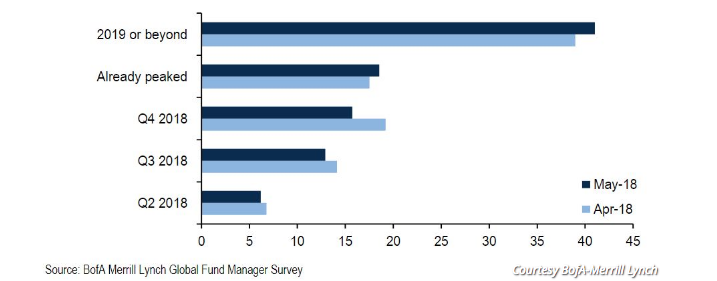 More than 3/4 of surveyed investors said that equities had yet to peak. Only 19% said that late January, the most recent record for both the Dow Jones Industrial Average and the S&P 500 represented the peak of the cycle. About 42% said the peak would come in 2019 or beyond. And what is driving this particular positive sentiment concerning equities…earnings!