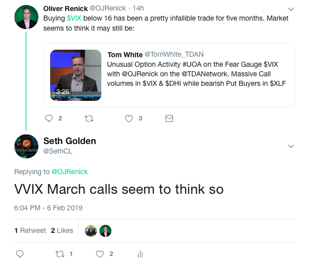 U.S. equity markets have climbed steadily through the New Year and broken above critical technical levels. We could see the S&P continue to trend higher or take step back. A pullback would be healthy. with that in mind, please click on the Daily, Technical Market Recap video link to review. Within the Technical Market Recap Wayne discusses what we saw recently in the VIX call options volume. Something Seth also denoted in a tweet as follows.