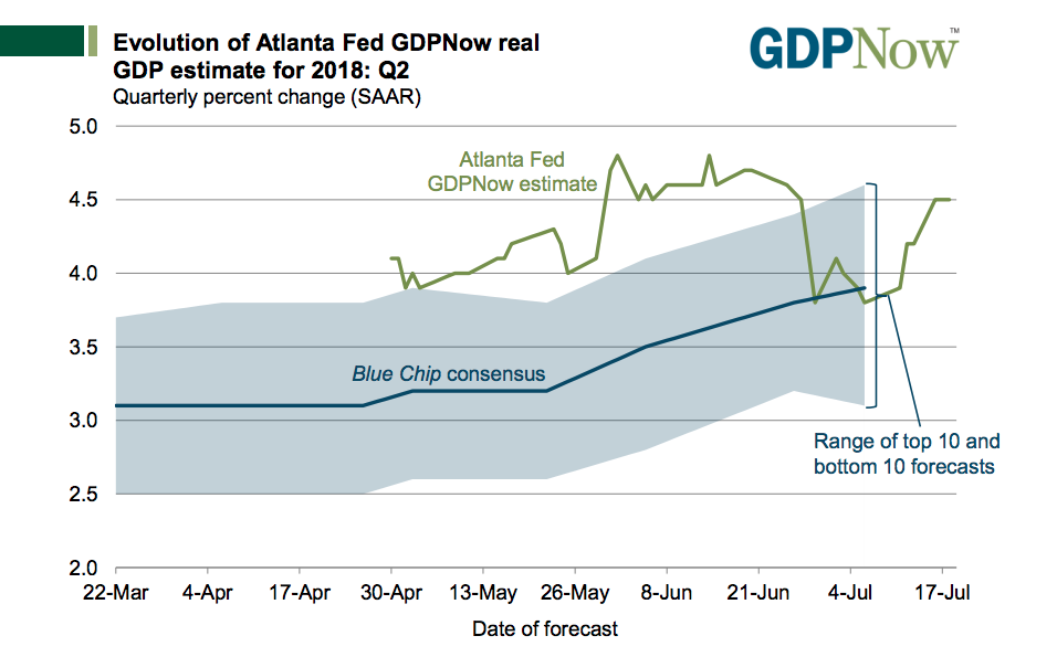 Switching gears from FAANG and earnings season here, the Commerce Department releases second-quarter GDP data on Friday at 8:30 a.m. Eastern time. There is a great deal of build up into the number with forecasts as high as 5% plus. The MarketWatch-compiled economist consensus calls for 4.3% growth, which would represent the fastest growth rate since the 5.2% gain put on the scoreboard for the third quarter of 2014.