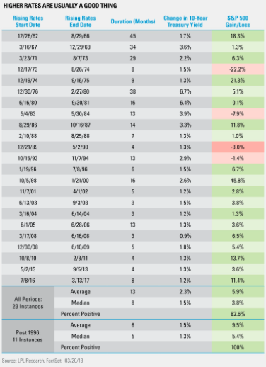 Rising rates and yields are always found within the bear-perspective and bull market pundit narrative. We can understand why this might be the case given the record levels of consumer, corporate and federal debt. Having said that, when we put things into their most appropriate perspective we come to realize that it’s all about where rates are expected to rise to and from whence the rise from. Rates are undeniably rising, in kind with the Fed rate hike cycle. Rising rates tend to place a burden on debt repayment, be it from the corporate or consumer sector. But rates are rising from all-time record low levels. When we review the Fed’s neutral rate stance of roughly 2.5% near-term and 3% longer-term, such levels are still below levels seen at the turn of the century and prior to the financial crisis of 2008. And this coming at a time when the labor market is seeing record low levels of unemployment and moderate wage increase. More importantly let’s look at the history of a rising 10-year yield and compare it with the S&P 500. After all, that’s what we more greatly consider as investors, the benchmark rate vs. the benchmark equity index.