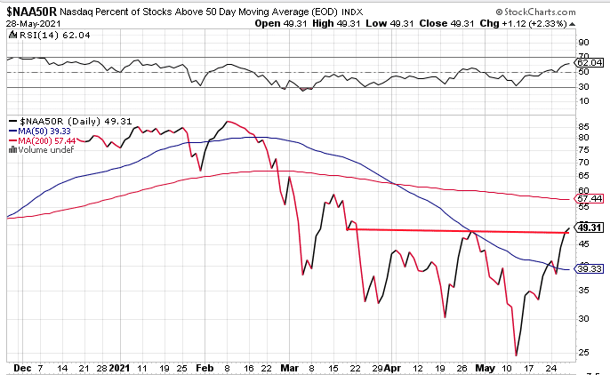 The better news is that the percentage level is better than it was in late April when the Nasdaq made its record high. The even better news is that the RSI for this breadth indicator is also better than the April period, suggesting the move in Nasdaq stocks participating in the uptrend is stronger today than the April period as well. The breadth indicator still did not finish the week at 50% (just shy of it), so we remain with a cautiously optimistic outlook and open-minded.