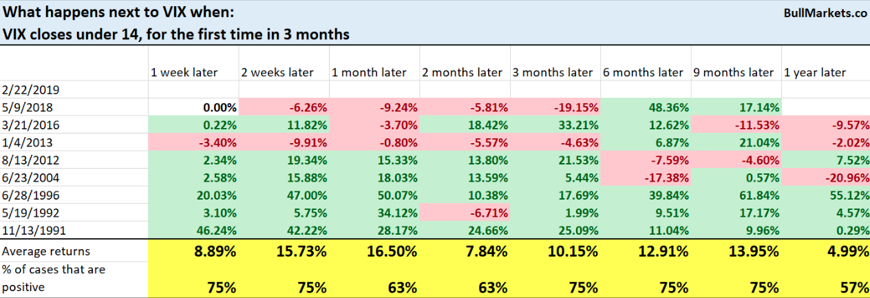 The VIX finished the previous week below 14 and had been lower for 9 consecutive weeks, a feat never accomplished in the index’s history. It was the first time the VIX had closed under 14 since October of 2018. Since the losing streak is a first of its kind for the index, historical statistical probabilities aren’t available without modifying the criterion and in effort to forecast the probabilities for the VIX going forward. With that in mind, here’s what happens next to the S&P 500 when the VIX closes under 14 for the first time in 3 months. (Tables from Troy Bombardia)