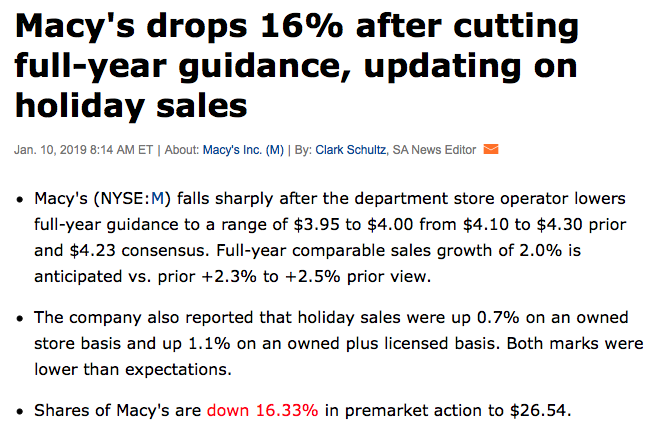 Ahead of the opening bell on Tuesday we’ll see quarterly results from the likes of Home Depot (HD) and Macy’s (M). Both stocks have seen there fare share of depreciation over the last 90 days and even with a modest rebound of late. With the housing sector in a cyclical decline, it remains to be seen if the do-it-yourself retailer can buck the overall retail trend. Macy’s, has it’s work cut out for itself after preannouncing a disappointing holiday season whereby the department store retailer lower its Q4 2018 guidance, siting a slowdown in the month of December. Analysts have cut their ratings and price target for share of M shortly after the January 10, 2019 press release.