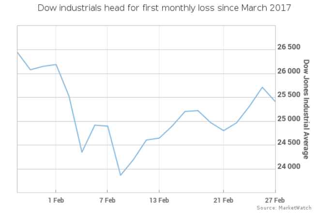 In terms of economic data for the day, the 2nd estimate for fourth-quarter U.S. gross domestic product comes out at 8:30 a.m. Eastern Time, with economists polled by MarketWatch expected to see 2.5% growth. The first estimate showed growth of 2.6%. At 9:45 a.m. Eastern, the Chicago PMI for February is due out, followed by a reading on pending home sales for January at 10 a.m. Eastern. Earnings are expected Wednesday from TJX Cos., Salesforce.com Inc., Lowe’s Cos., Office Depot Inc., Mylan NV, Hostess Brands Inc, L Brands Inc. and Monster Beverage Corporation.