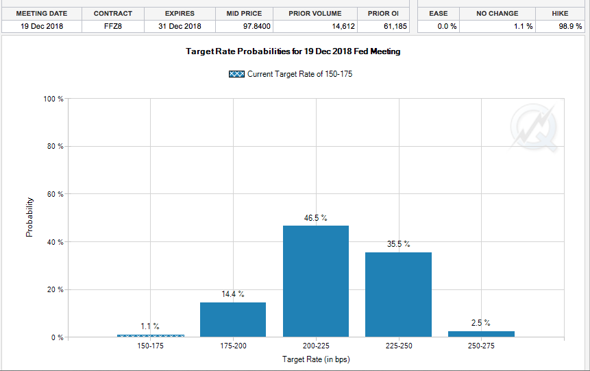 Prior to the Fed minutes, there had been a great deal of consternation surrounding the possibility of the Fed accelerating rate hikes given that the PCE would achieve 2% near term and probably rise above that rate thereafter. The CME’s FedWatch Tool at one point indicated a 50% probability of a 4th rate hike to occur in December, partly due to this inflation data. Just before the Fed minutes and over the last 30 days, the December Fed Funds contracts pointed to a 40.8% chance of a 4th rate hike as seen in the photograph below.