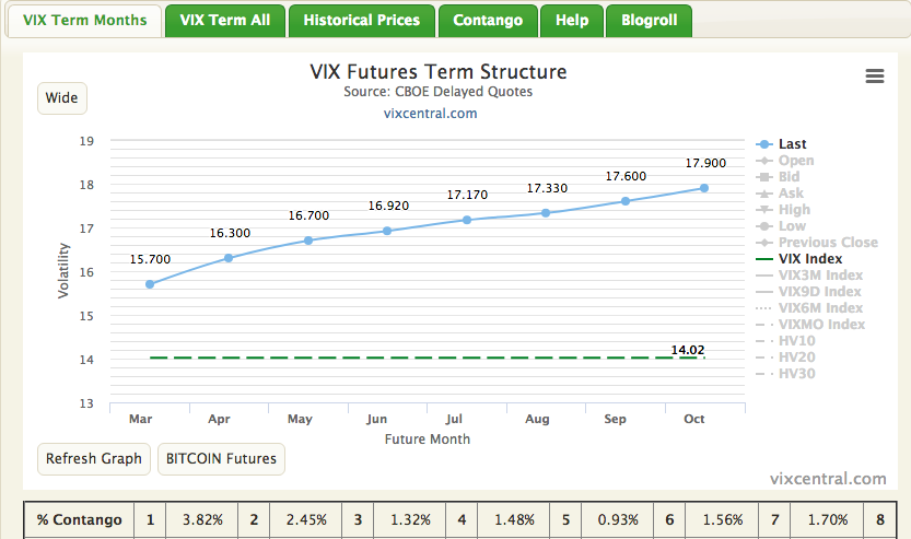 The VIX has continued to baffle those who assumed that volatility was here to stay. Today, the VIX achieved a level it hadn’t achieved since October 3rd of last year. The VIX closed near the low of the day at 14.02 and briefly broke below 14 to achieve 13.99 intraday. This has also manifested itself in the VIX of VIX or (VVIX) which finished at 75.59 on the day. And this has manifested itself into the highest contango in the VIX Futures market since last October as well.
