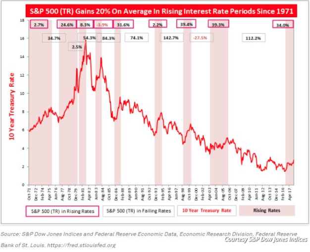 On the heels of the Fed minutes being released, the 10-year Treasury rose to as much as 2.95% identifying that there is still a debate regarding inflation. This debate feeds upon itself and manifests in equity prices. But make no mistake about it; throughout history when rates rise it is normal to witness equity prices rise in tandem. Despite the recent rollercoaster ride in equity markets, historically, “equities have gained significantly in periods of rising rates,” wrote Jodie Gunzberg, managing director and head of U.S. equities at S&P Dow Jones Indices, in an email.