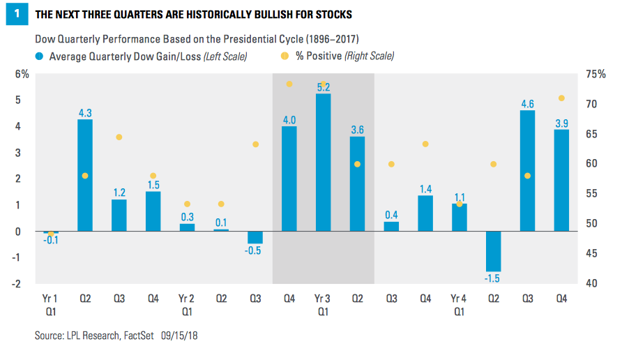 “As the chart shows, the period from the fourth quarter of year two through the second quarter of year three has historically been the best nine-month period of the entire cycle (going back 120 years on the Dow Jones Industrials). Note that some of this seasonal boost may have been pulled forward into years one and two, so it may be prudent to temper expectations some.”