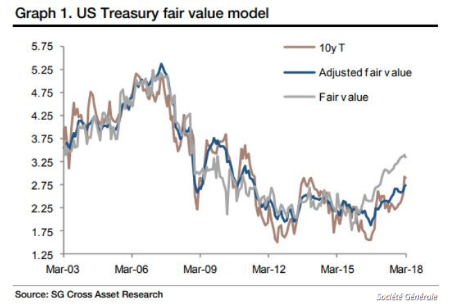 They determined that the fair value of the 10-year Treasury yield based on the U.S. economy’s current trajectory was currently around 3.30%, highlighted by the gray line, though that fell to 2.75% once the estimates accounted for the way unconventional monetary policies depressed bond yields across the world.