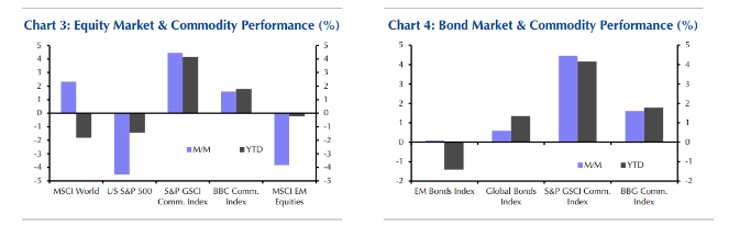 While some analysts and economists have focused on bond yields recently, others correlate the geopolitical risks with commodity outperformance. In fact, the return of geopolitical turmoil has led commodities to largely outperform equities and bonds over the last month and since the start of the year, the analysts at Capital Economics observed, pointing to the chart below:
